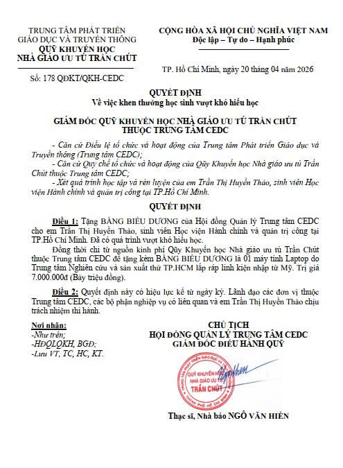 Ngày 20 tháng 04 năm 2026, Chủ tịch Hội đồng quản lý, Giám đốc điều hành Qũy Khuyến học Nhà giáo ưu tú Trần Chút thuộc Trung tâm CEDC đã ký Quyết định số: 178 QĐKT/QKH-CEDC tặng BẰNG BIỂU DƯƠNG của Hội đồng Quản lý Trung tâm CEDC cho em Trần Thị Huyền Thảo, sinh viên Học viện Hành chính và quản trị công tại TP.Hồ Chí Minh. Đã có quá trình vượt khó hiếu học.