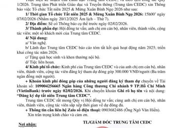 Thực hiện kế hoạch của Lãnh đạo Trung tâm CEDC, và theo lịch công tác Quý 1/2026. Trung tâm Phát triển Giáo dục và Truyền thông (Trung tâm … Đọc tiếp Thông báo Tổ chức Tất niên 2025 & Mừng Xuân Bính Ngọ 2026